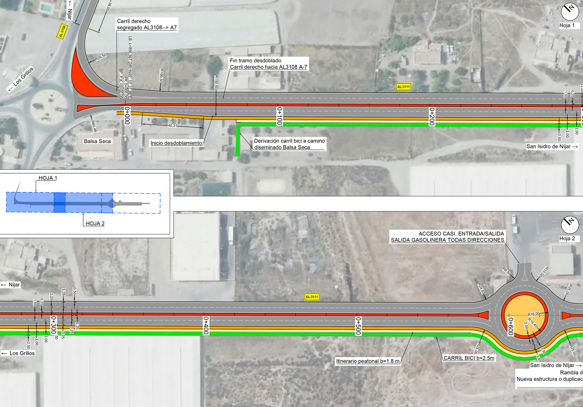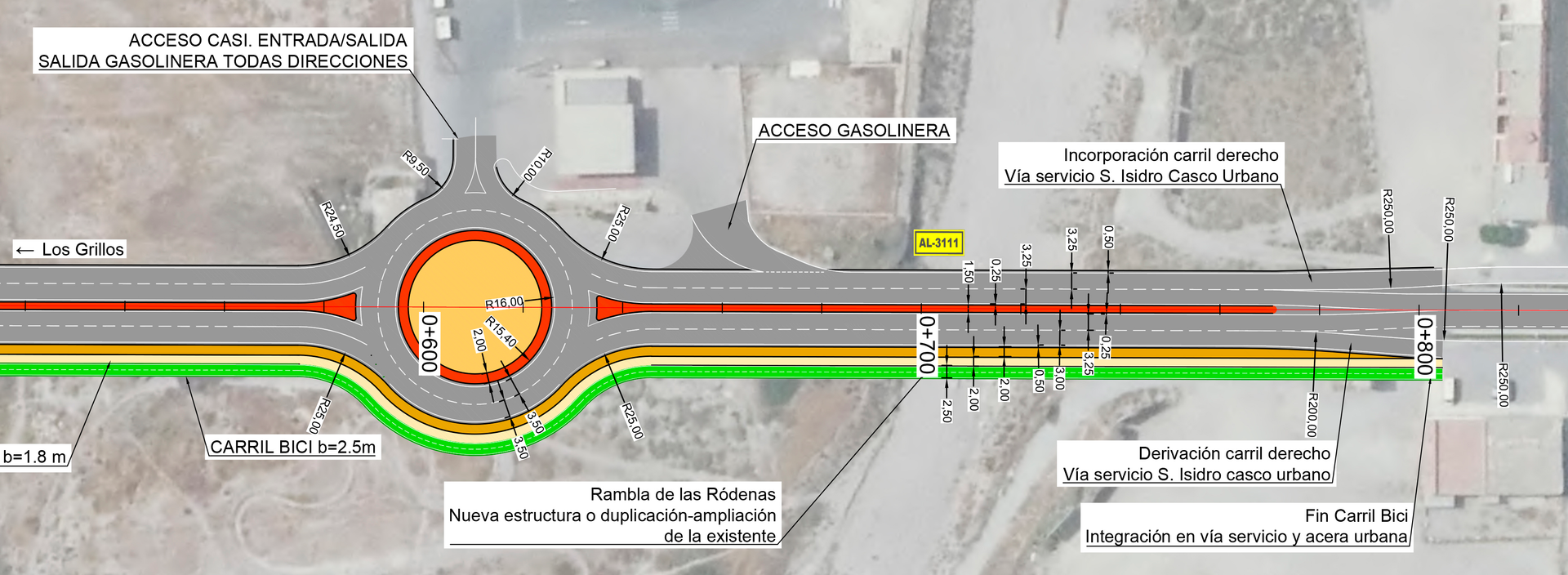 Se construyó un carril ciclopeatonal en la margen derecha de la carretera AL-3111, desde el cruce con el camino de Los Pelaos (PK 9+000) hasta el PK 11+400. La separación estándar entre la calzada y el carril bici fue de 3,00 m, reduciéndose solo en casos justificados.